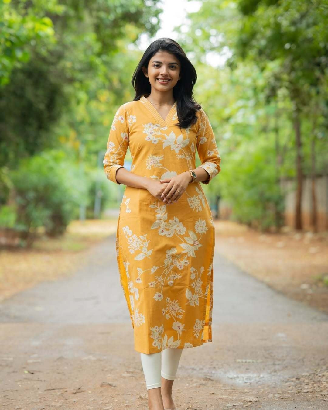 The mustard yellow base is beautifully adorned with subtle floral prints, giving it a refreshing and elegant vibe — perfect for daily wear, office looks, or casual outings. The V-neck design and 3/4th sleeves add a touch of sophistication, while the straight cut ensures a flattering fit for all body types.